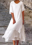 Questo vestito bianco con strati asimmetrici e taglio morbido è l’essenza della freschezza e dell’eleganza rilassata.
