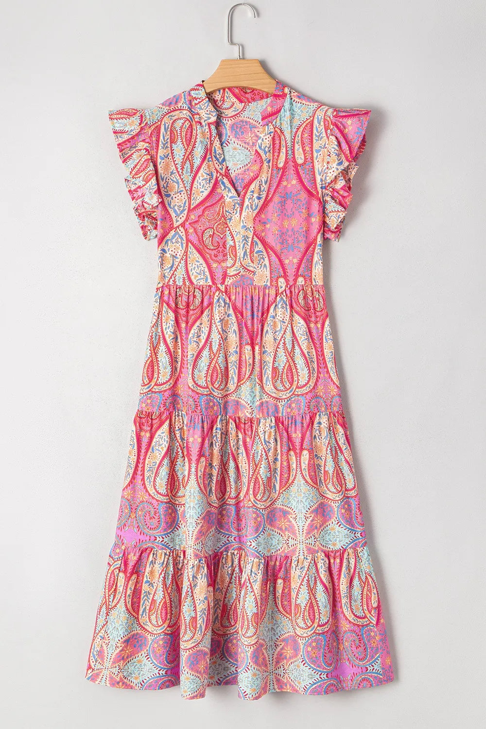 Questo abito midi in stile boho conquista con la sua fantasia paisley vivace e femminile.