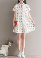 Questo abito chemisier corto in cotone, con stampa di piccoli uccellini colorati, unisce semplicità e allegria in un unico capo.