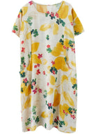 Questo abito corto in lino con stampa di limoni e fiori è il perfetto mix tra comfort e allegria.