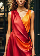 Questo abito corto in raso con drappeggio asimmetrico è un’esplosione di stile e femminilità.
