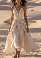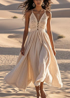 Questo abito lungo unisce il fascino bohémien del pizzo con la leggerezza del tessuto fluido, creando un look romantico e raffinato.