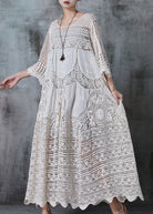 Questo abito lungo in pizzo con lavorazione crochet è un capolavoro boho chic che unisce romanticismo e leggerezza.