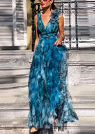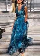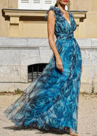 Questo abito lungo in tulle stampato con profondo scollo a V e dettagli arricciati sulle spalle emana grazia e femminilità.