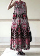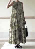 Questo abito lungo senza maniche con stampa geometrica ondulata è la scelta ideale per chi ama comfort e stile in un solo capo.