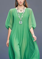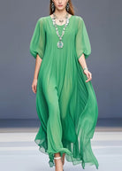 Questo abito lungo in chiffon verde smeraldo incanta con la sua leggerezza e il suo movimento fluido.