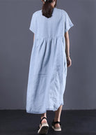 Questo abito in cotone e lino color azzurro è perfetto per la stagione calda. Con il suo taglio ampio e la linea essenziale, offre libertà di movimento e uno stile minimal chic.