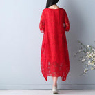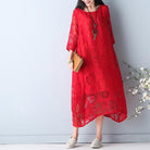 Questo abito lungo in pizzo rosso con motivo floreale è leggero, ampio e ricco di personalità.