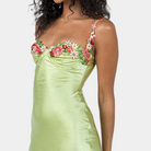 Questo abito lungo in raso con dettagli floreali sul corpetto è la scelta perfetta per un outfit sofisticato e femminile.
