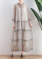 Questo abito lungo con strato superiore in tulle trasparente è romantico e raffinato, con giochi di trasparenze e dettagli arricciati che lo rendono unico.