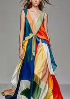 Questo abito lungo multicolore è un'esplosione di vivacità e raffinatezza, perfetto per distinguerti in ogni occasione.