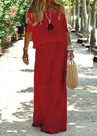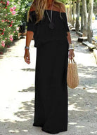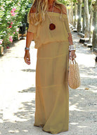 Questo abito lungo off-shoulder in chiffon è perfetto per le giornate calde e per look estivi dall’eleganza rilassata.