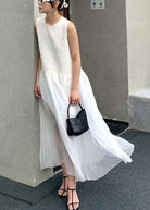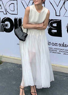 Questo abito lungo senza maniche unisce raffinatezza e freschezza con una gonna plissettata dal movimento fluido.