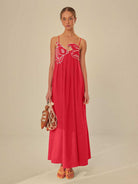 Realizzato per catturare ogni sguardo, questo abito maxi in rosso vibrante è impreziosito da raffinati ricami floreali sul corpetto che aggiungono un tocco artigianale e romantico. La silhouette fluida con spalline sottili crea un look arioso e spensierato, ideale per serate d’estate, feste in spiaggia o brunch sotto il sole. Il design senza tempo e il colore audace lo rendono un capo statement perfetto da sfoggiare con sicurezza.
