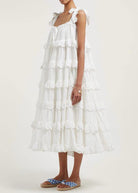 Questo vestito a balze con spalline annodate è femminile, arioso e dal fascino sognante.