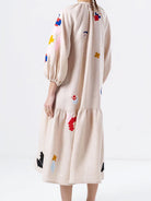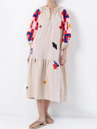 Questo abito midi è una vera opera d'arte da indossare. Realizzato in un tessuto leggero color crema, si distingue per la sua silhouette oversize e i ricami vivaci a contrasto che decorano maniche e corpo con motivi astratti. Le maniche voluminose e lo scollo arricciato conferiscono un'aria bohémien sofisticata, ideale per chi ama l’originalità e la libertà di movimento senza rinunciare allo stile.