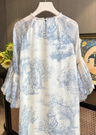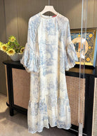 Questo vestito midi in stile vintage con stampa toile de Jouy regala un fascino senza tempo.