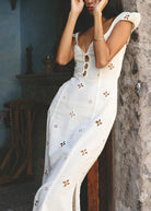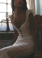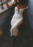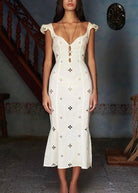 Questo abito midi aderente color avorio, con dettagli traforati e scollo profondo, unisce sensualità e raffinatezza in un design intramontabile.