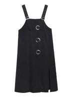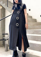 Questo vestito nero lungo con maxi occhielli e spalline regolabili ha un design urban e avanguardista.
