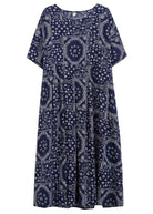Questo maxi dress con fantasia geometrica e floreale è ampio, fresco e perfetto per chi ama un look boho e pratico.