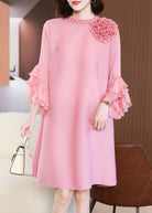 Questo vestito rosa con maniche a balze e applicazione floreale è la scelta perfetta per un look sofisticato e romantico.