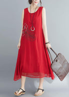 Questo abito rosso smanicato, con delicata stampa floreale, è ideale per un look fresco, femminile e senza tempo.