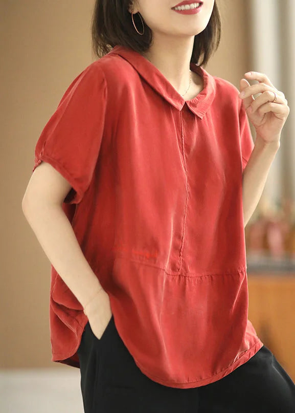 Questa blusa a maniche corte unisce semplicità e raffinatezza con il suo taglio morbido e il colletto delicato.