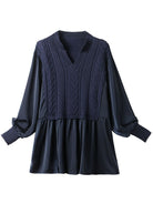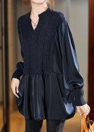 Questa blusa blu scuro combina un corpino lavorato a maglia con maniche ampie in tessuto fluido.