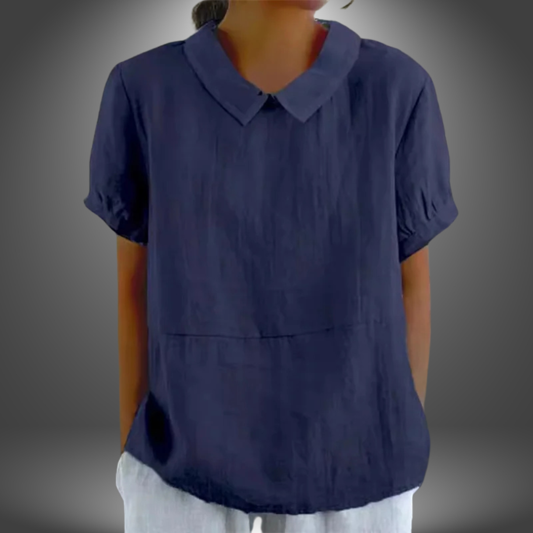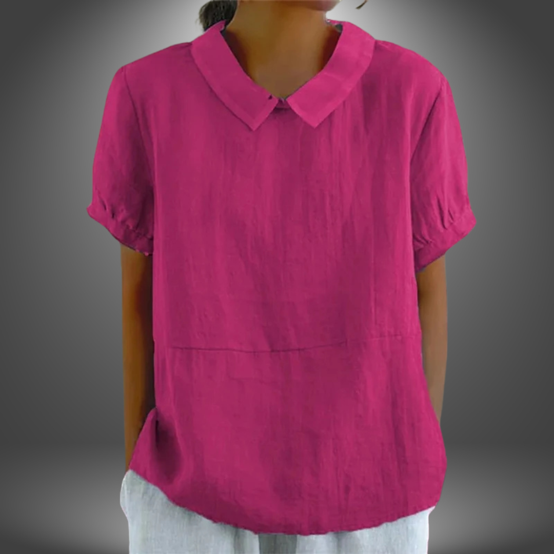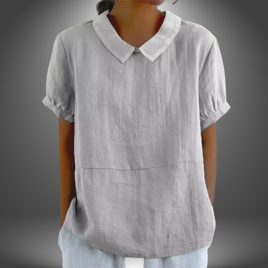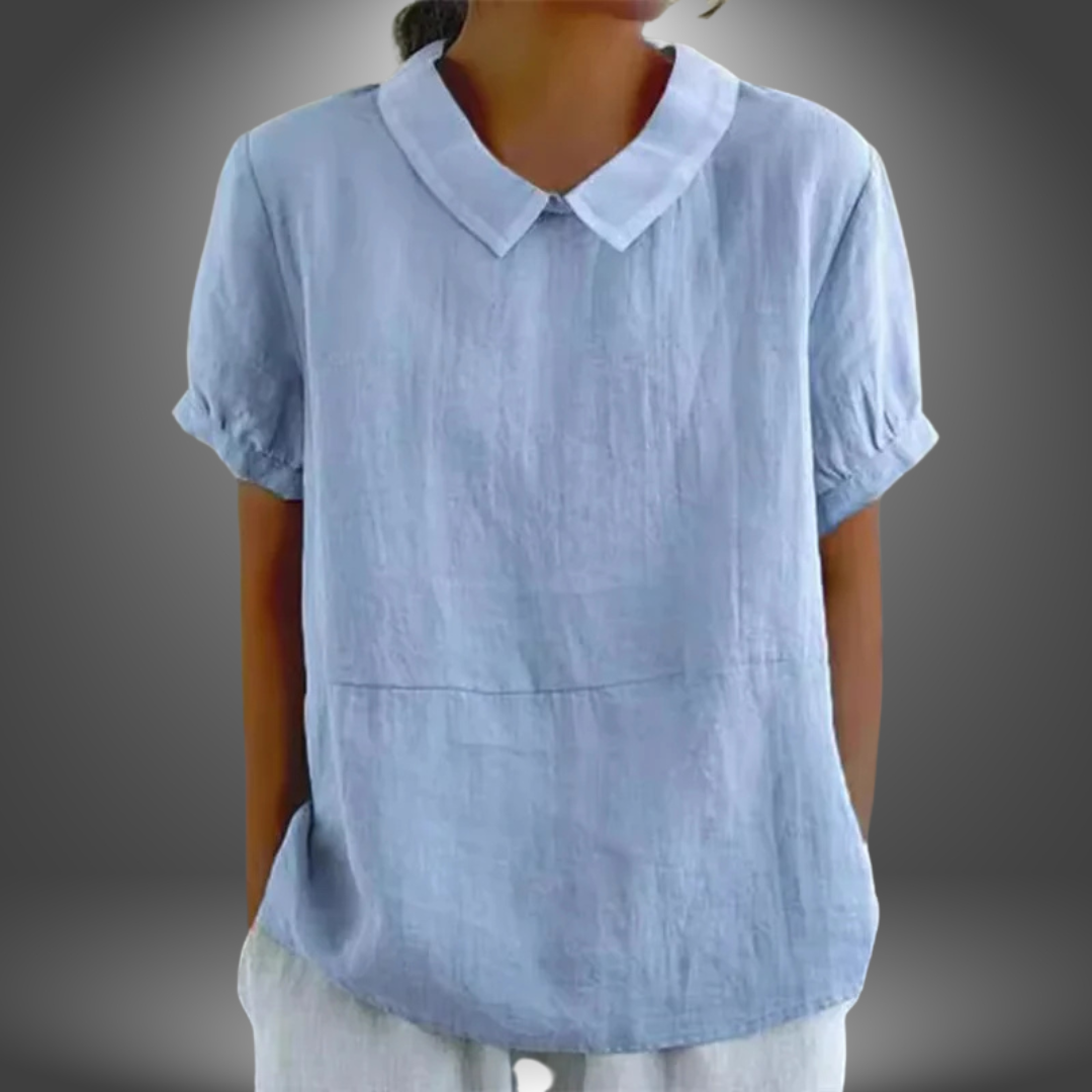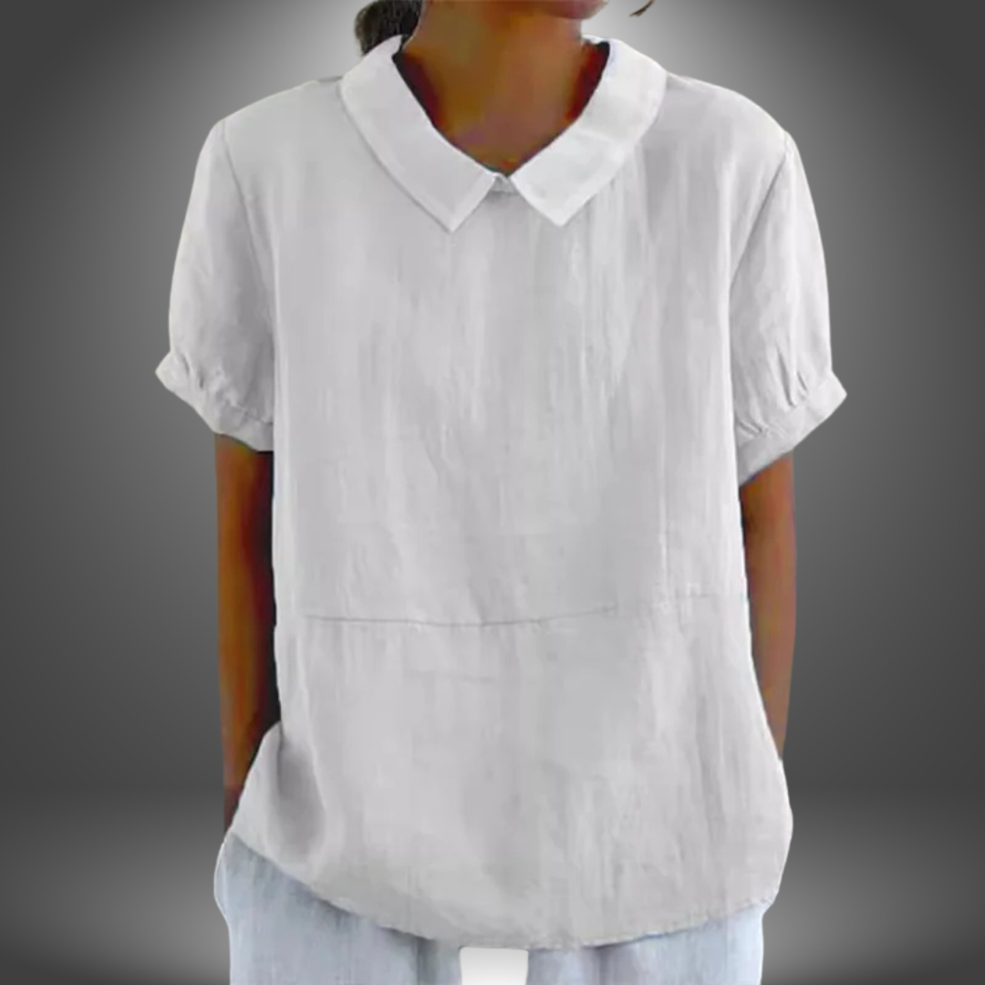 Questa blusa in lino con colletto rotondo e maniche corte è fresca, leggera e perfetta per l’estate.