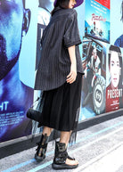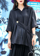 Questa blusa asimmetrica a righe dona un tocco moderno e creativo a qualsiasi outfit.