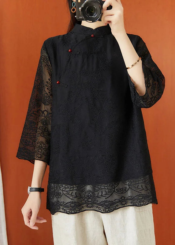 Questa blusa nera ricamata con dettagli in stile cinese è la scelta perfetta per un look raffinato e distintivo.