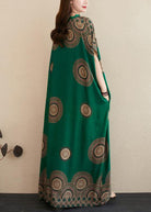 Questo maxi caftano verde con fantasia tribale circolare è la scelta perfetta per chi ama uno stile boho, ampio e ricco di personalità.