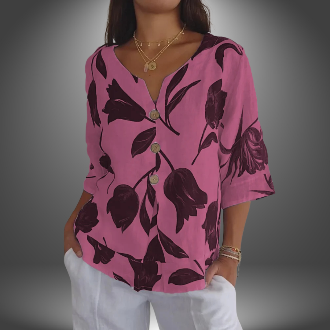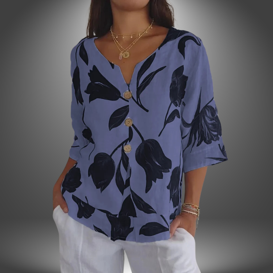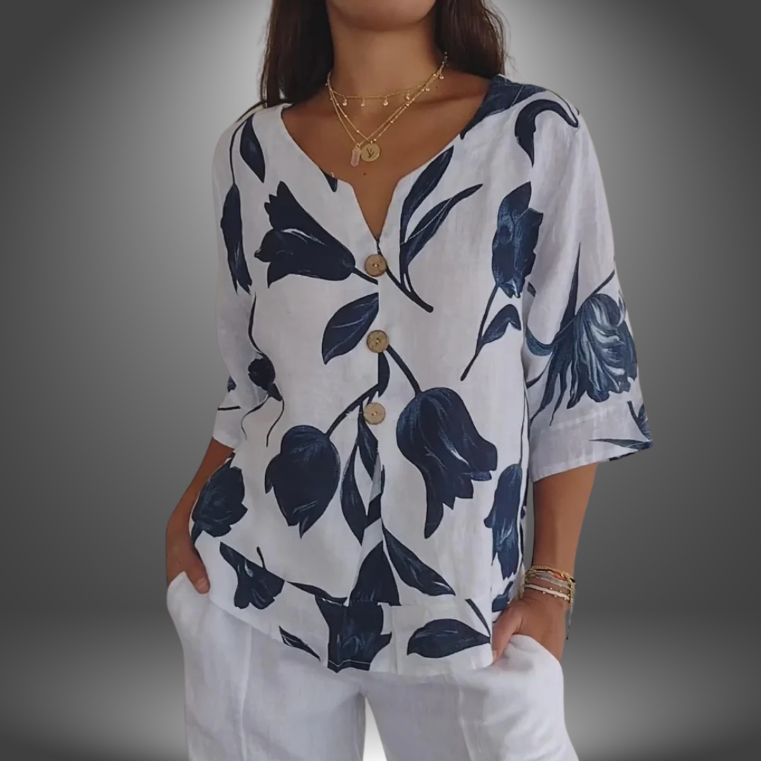 Questa camicetta in lino con stampa floreale è l’ideale per un look elegante ma rilassato.