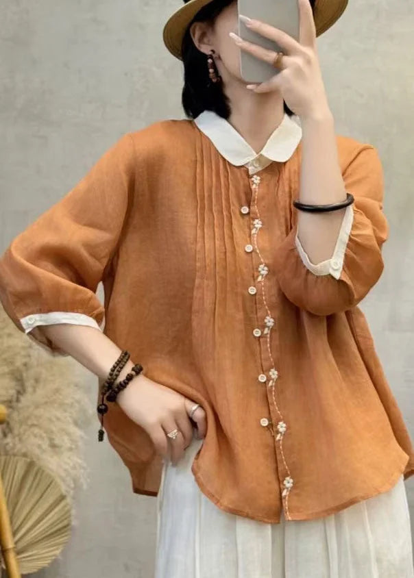 Questa blusa in lino arancio bruciato con bottoni floreali è perfetta per chi ama distinguersi con stile e semplicità.