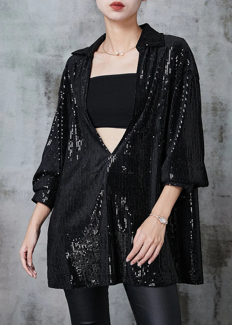 Questa camicia lunga con paillettes nere dona un tocco scintillante e sofisticato al tuo look da party.