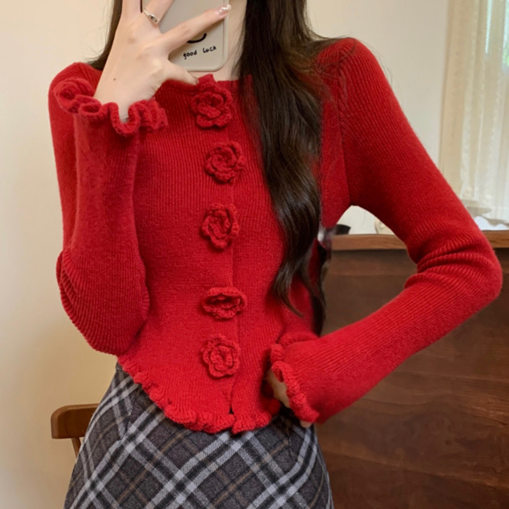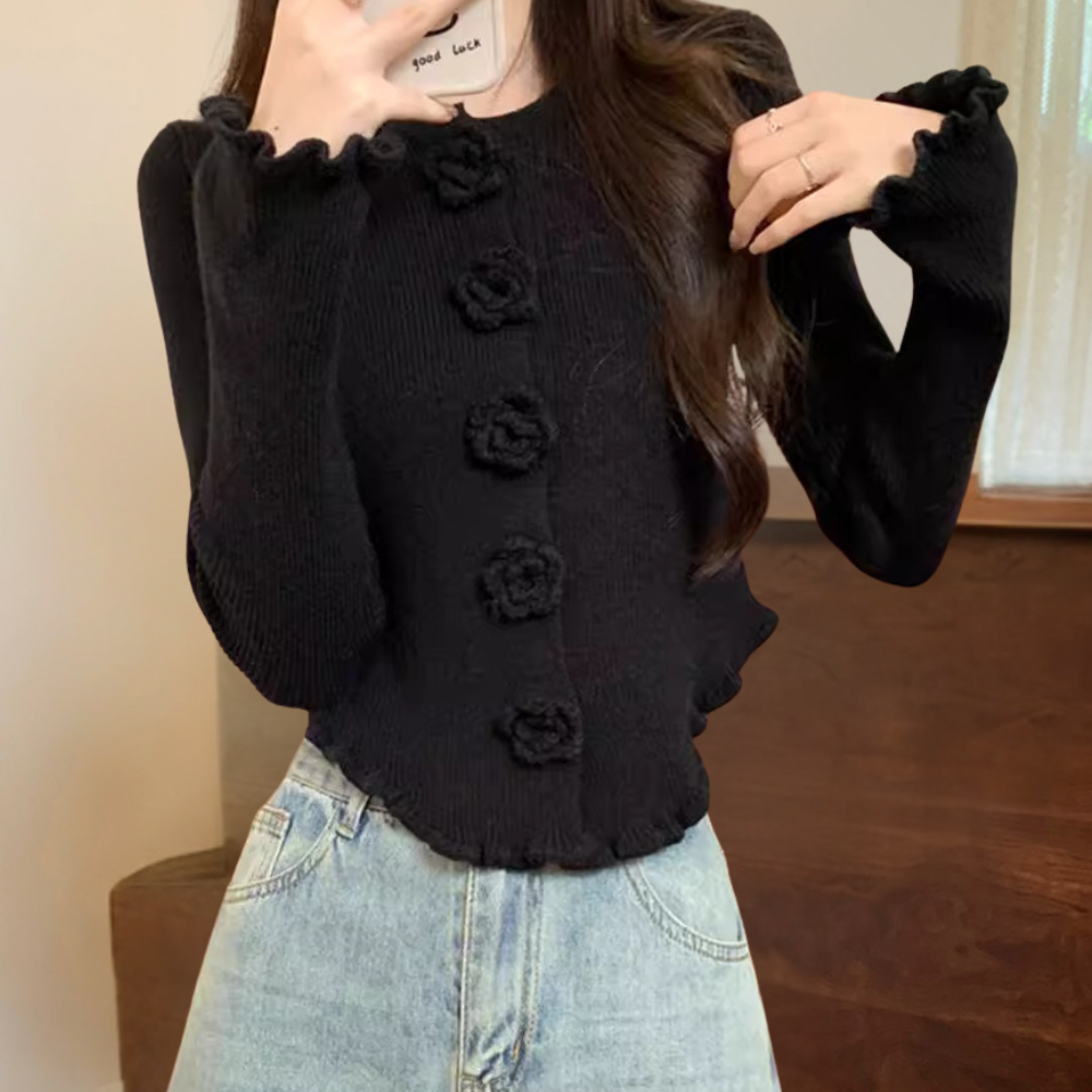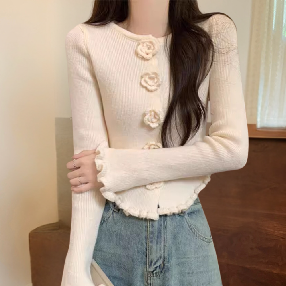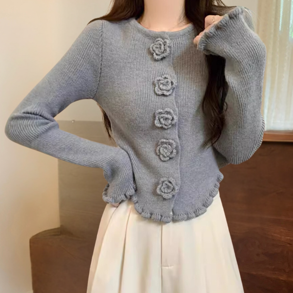 Questo cardigan aderente con bottoni a forma di fiore è perfetto per un look delicato e raffinato.