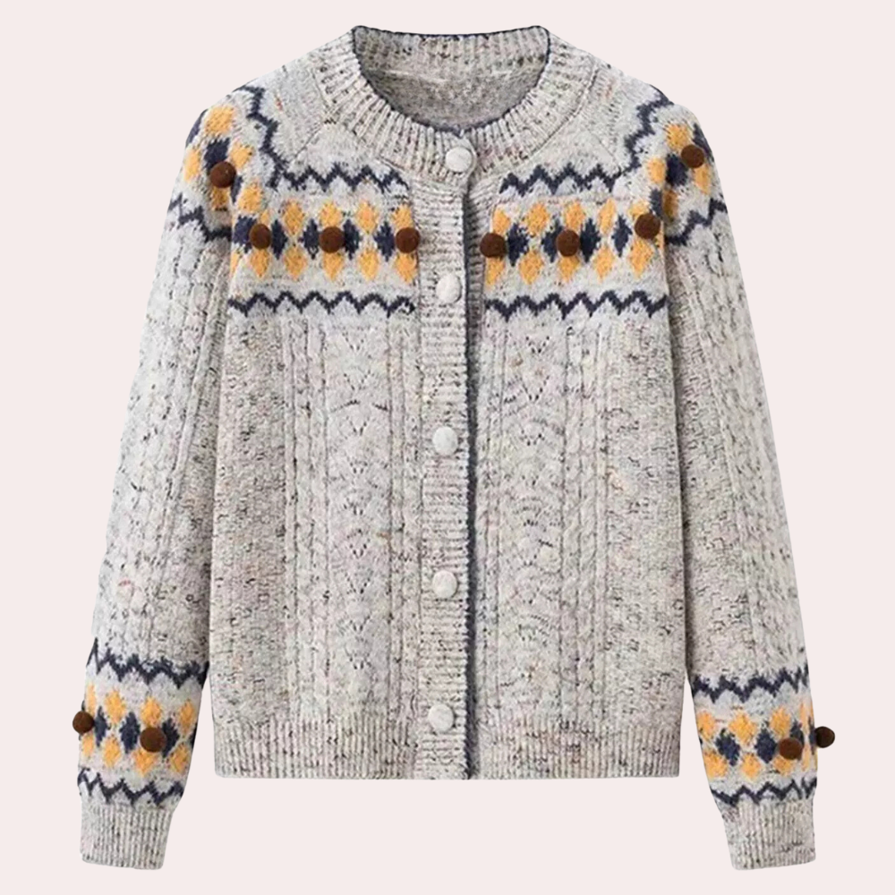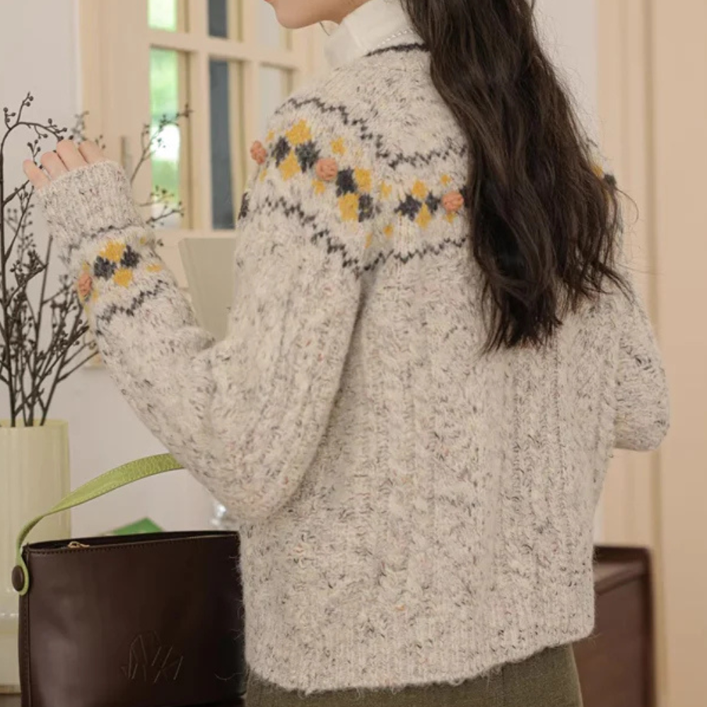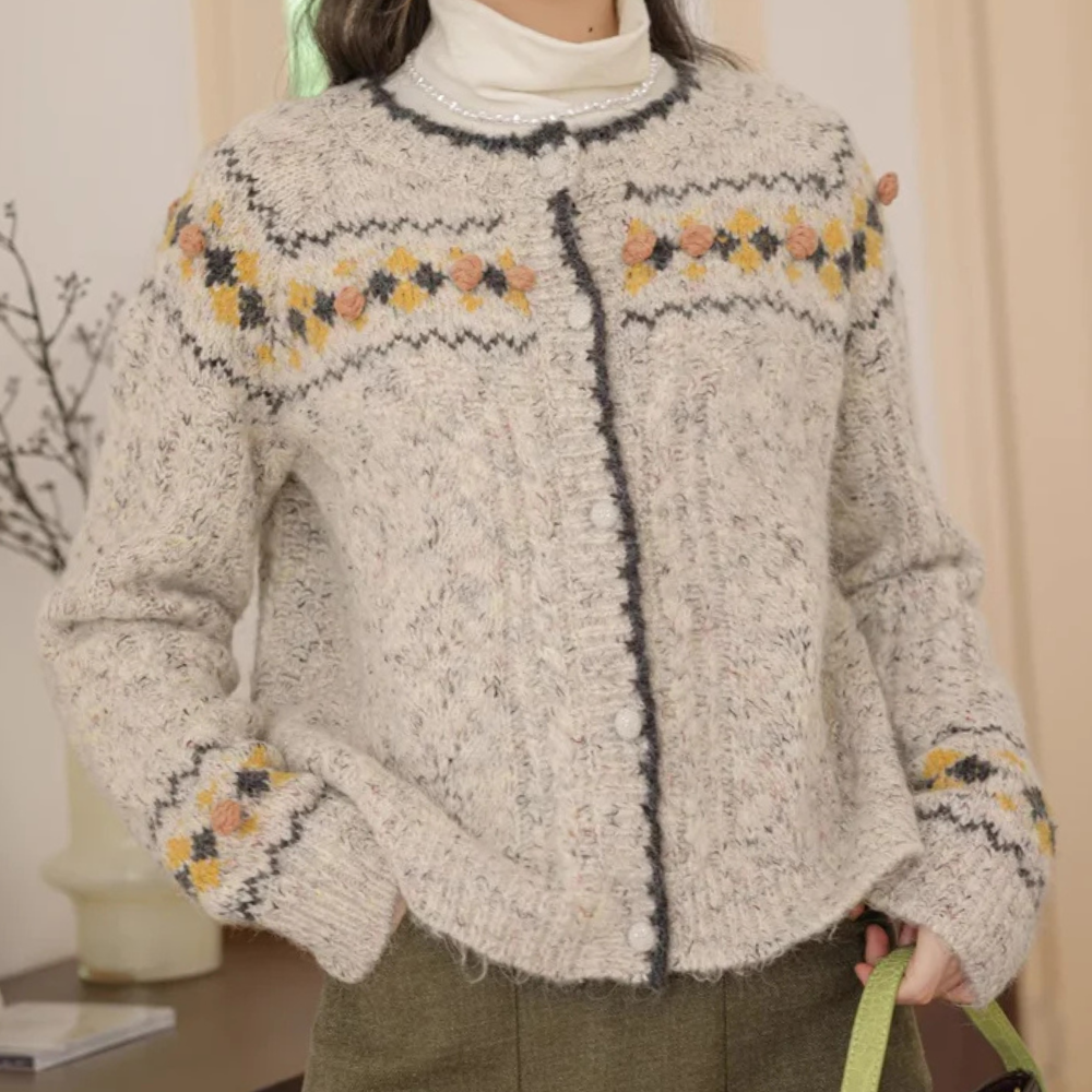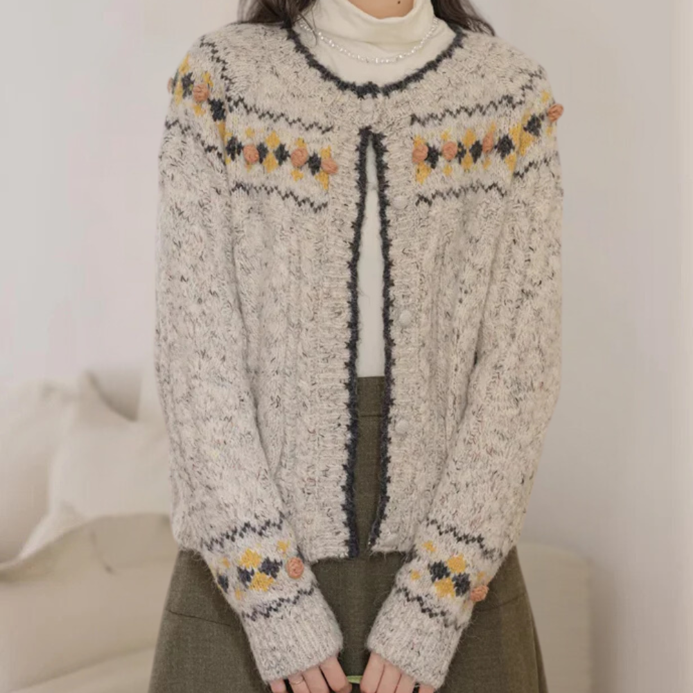 Questo cardigan lavorato a maglia con motivo nordico è perfetto per un look cozy e romantico.