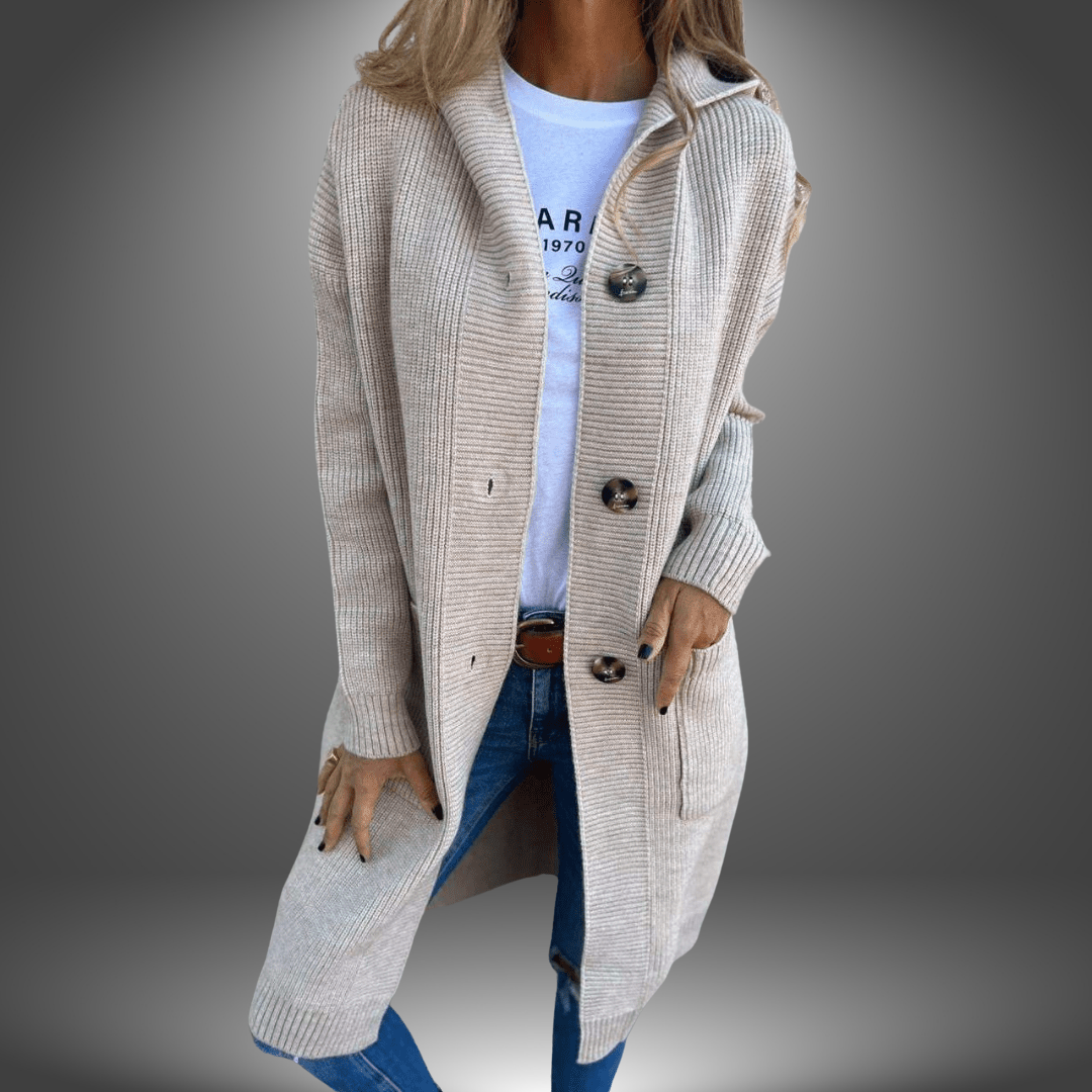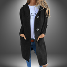 Questo cardigan lungo con bottoni e cappuccio è il capo ideale per un look casual ma curato.
