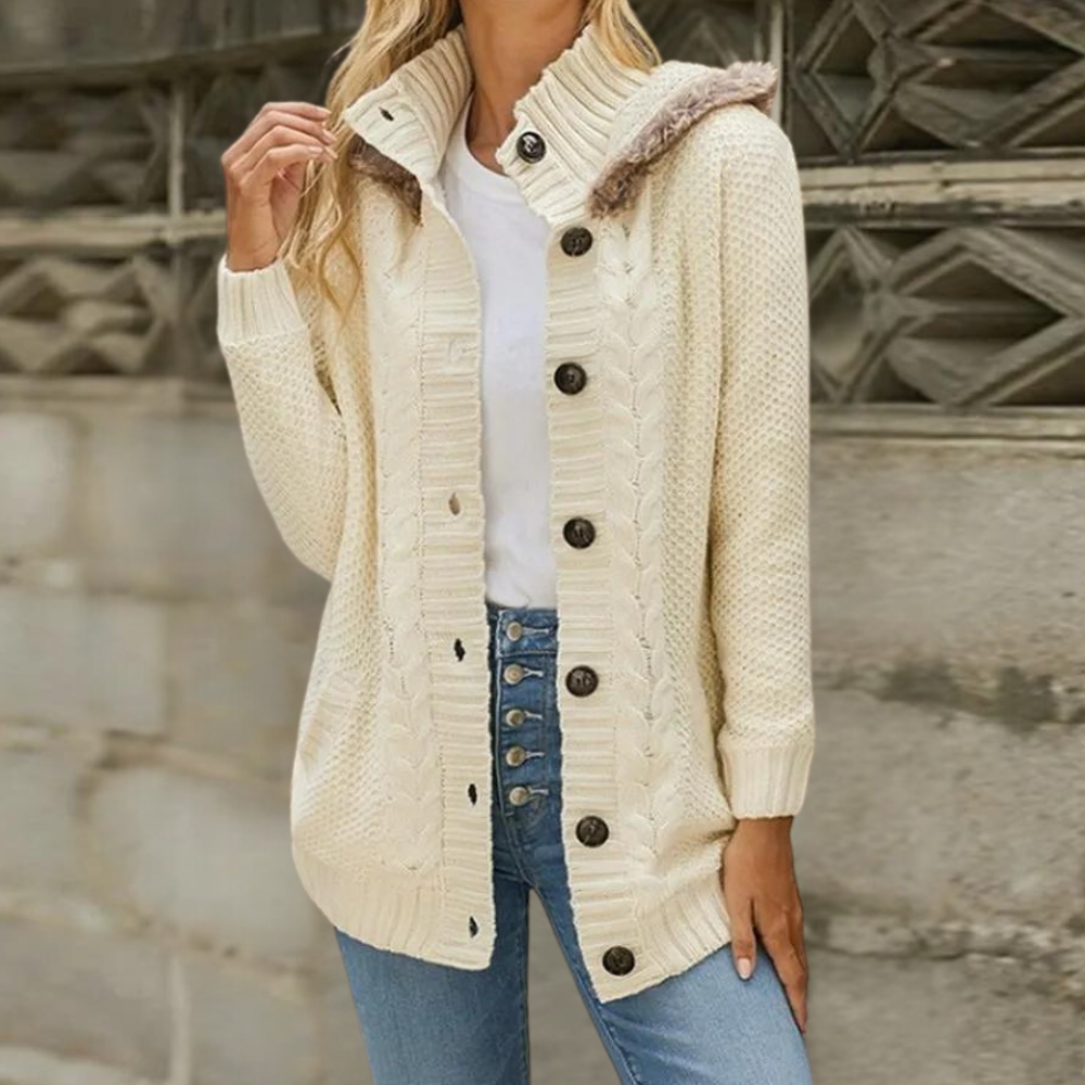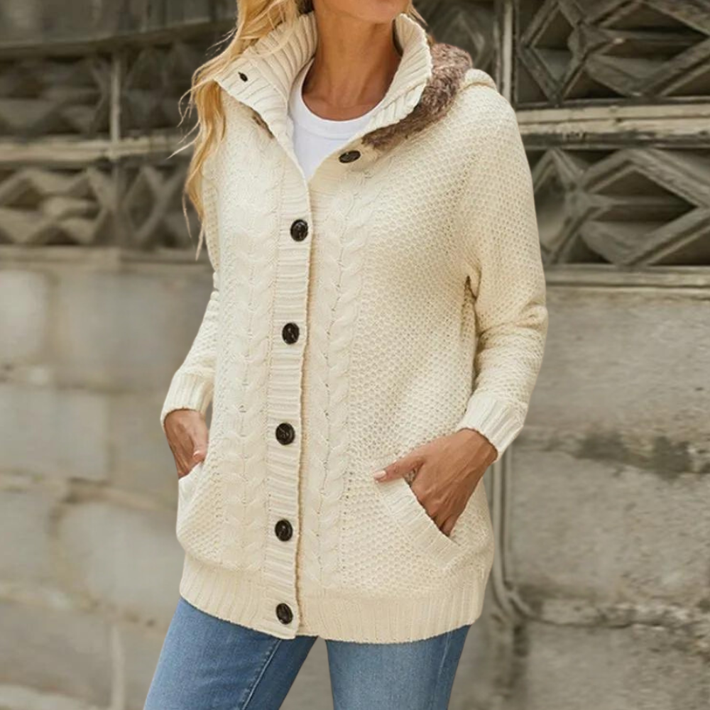 Questo cardigan lungo con cappuccio foderato in eco-pelliccia è perfetto per affrontare il freddo con stile.