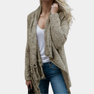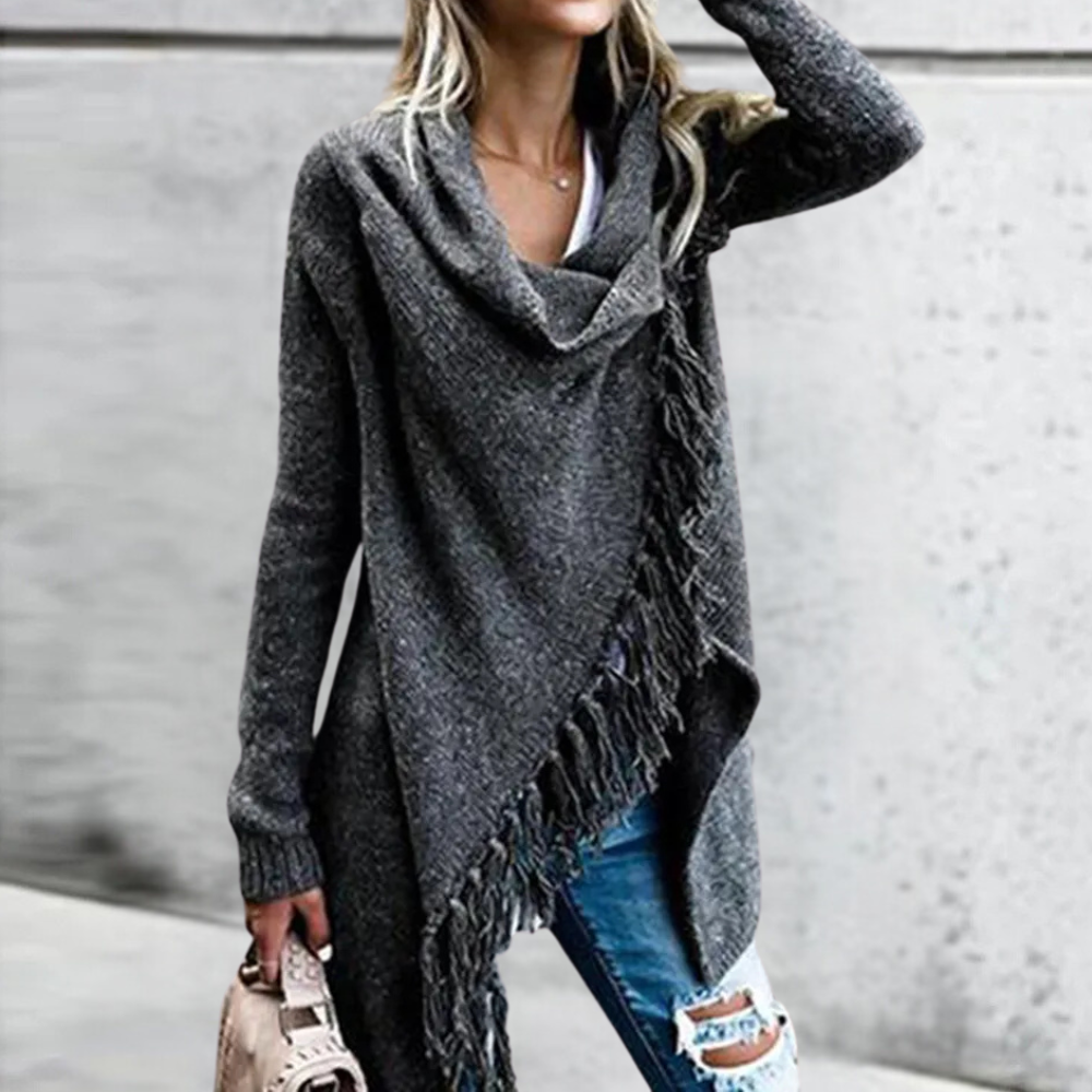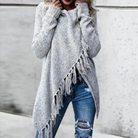 Questo cardigan lungo asimmetrico con frange è perfetto per un look sofisticato e confortevole.