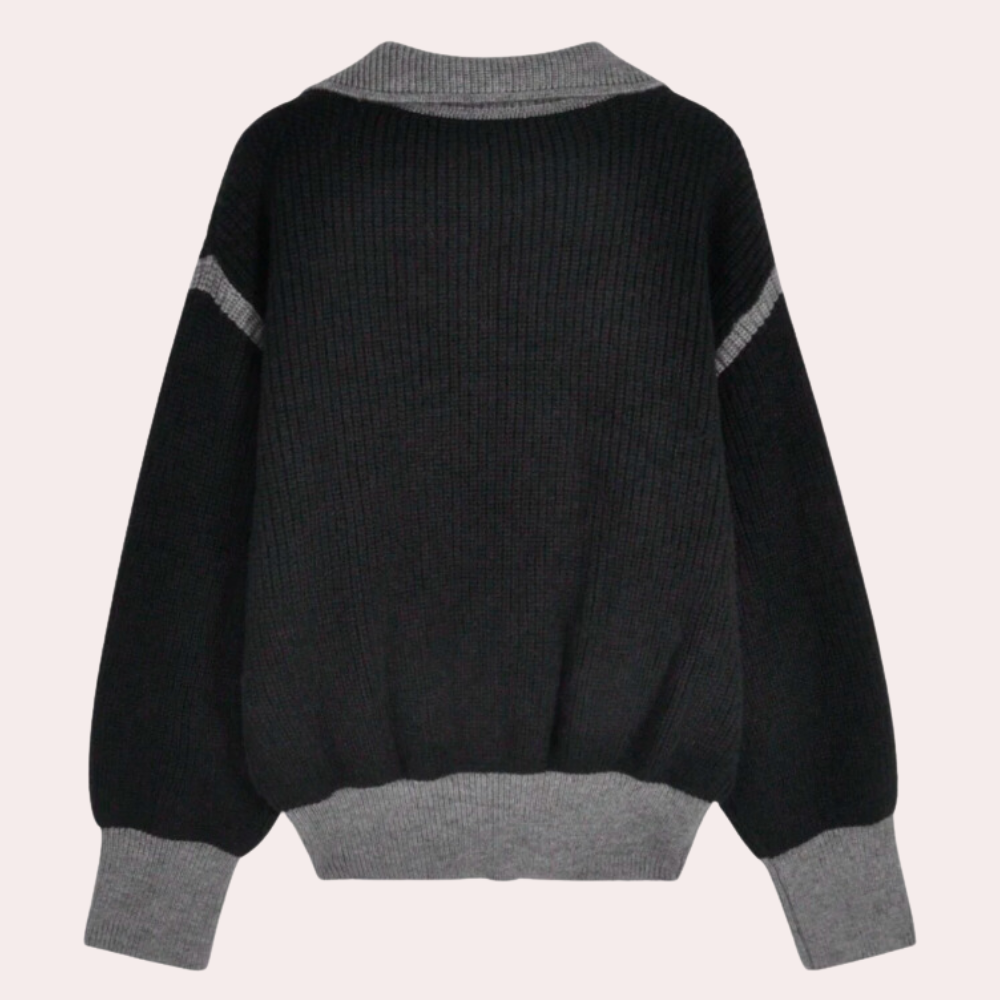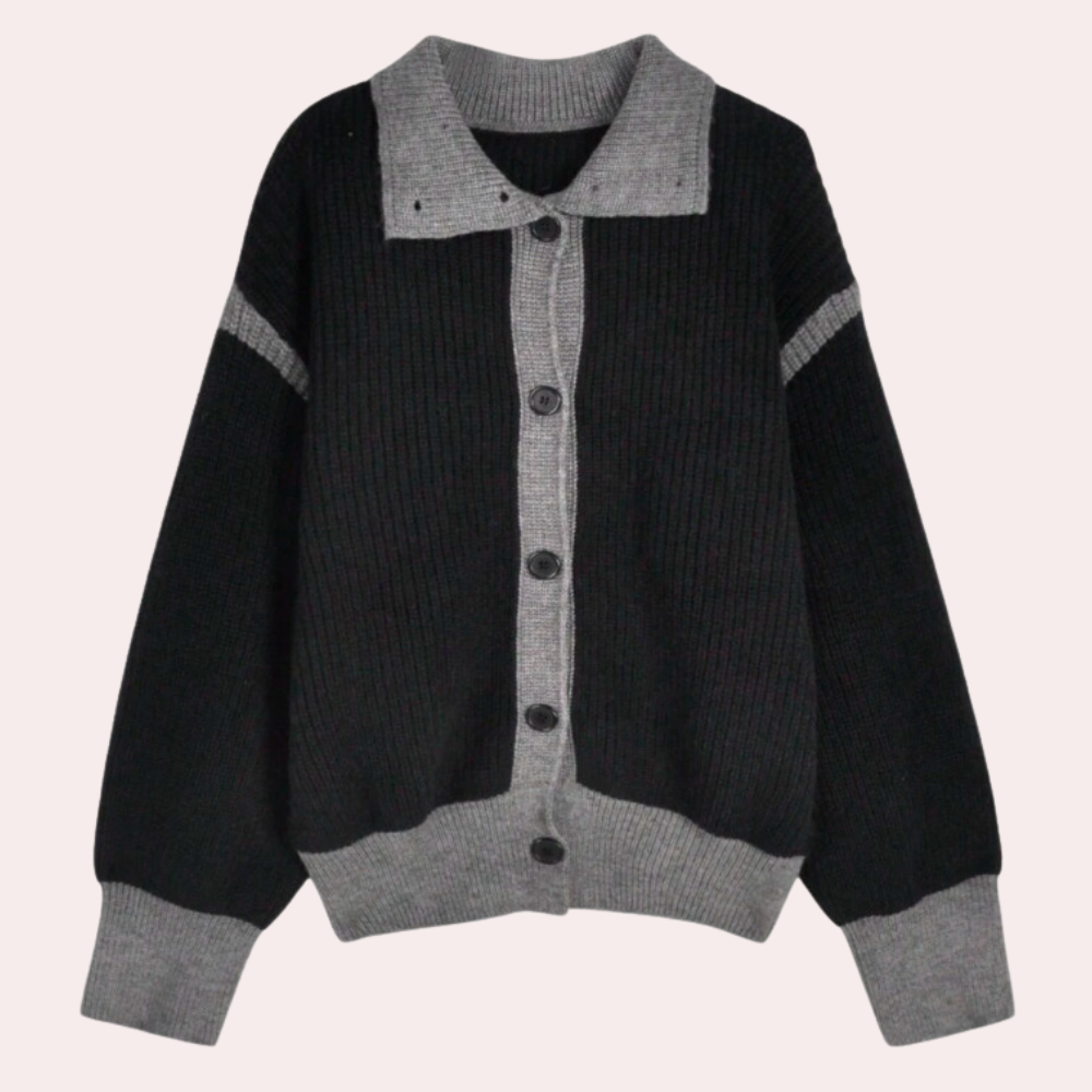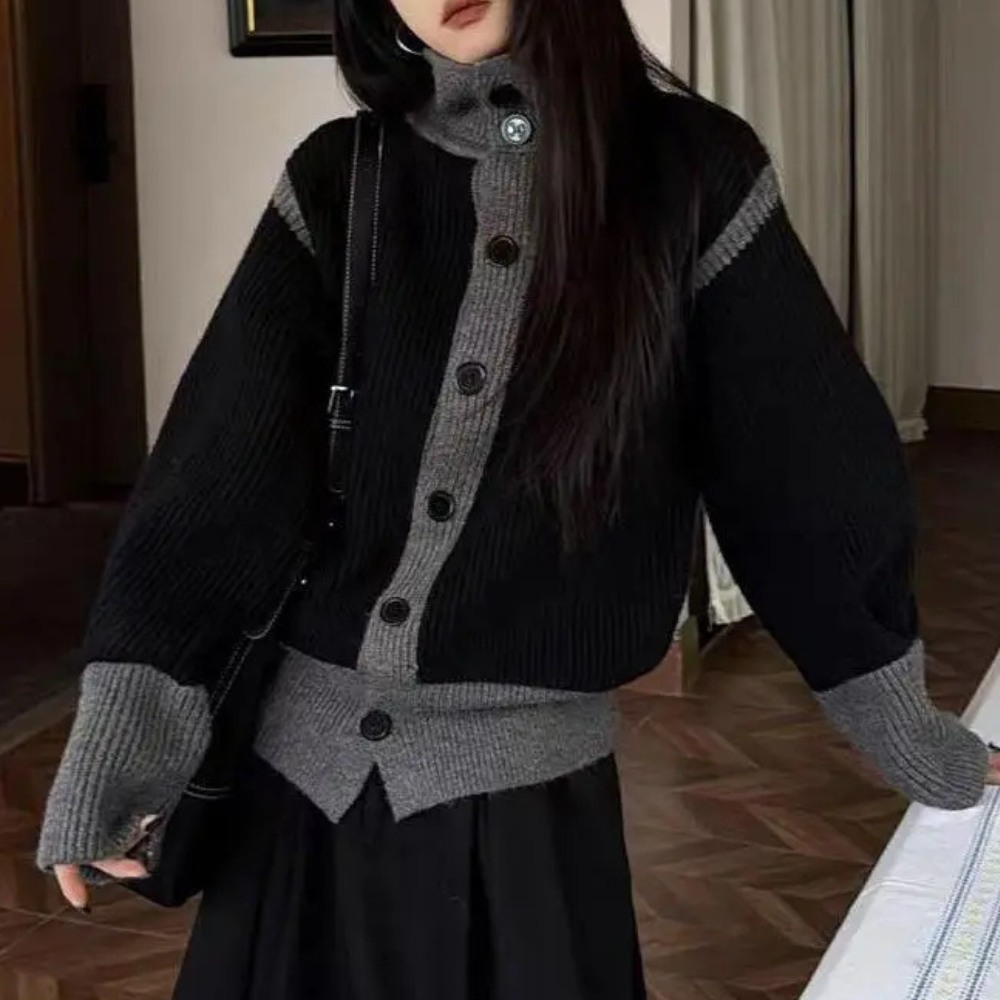 Questo cardigan bicolore con collo alto e bottoni è perfetto per un look casual chic e confortevole.
