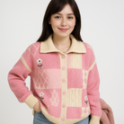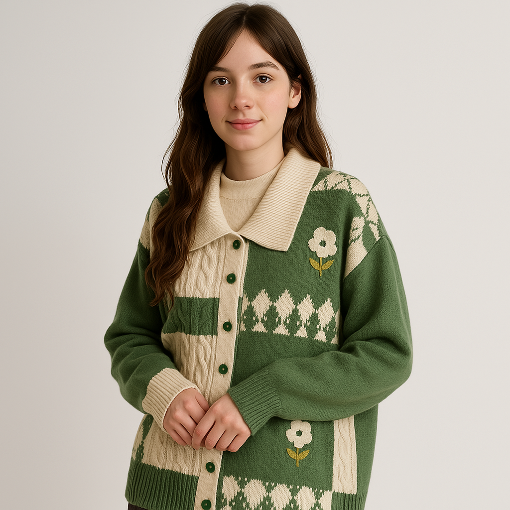 Questo cardigan patchwork unisce il fascino rétro al comfort moderno grazie ai suoi motivi floreali e geometrici.