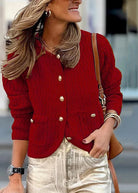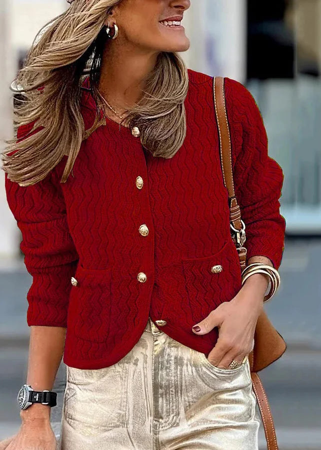 Questo cardigan rosso con bottoni dorati e tasche frontali dona personalità e raffinatezza al tuo look.