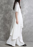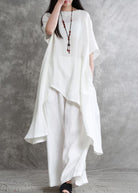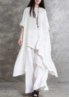 Questo completo due pezzi in cotone bianco, composto da tunica asimmetrica e pantaloni larghi, è perfetto per un’eleganza minimal e senza sforzo.