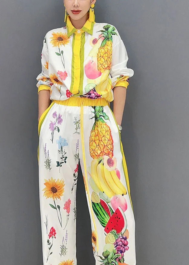 Questo completo camicia e pantalone è un’esplosione di colori e dettagli fruttati, ideale per chi ama farsi notare con stile.
