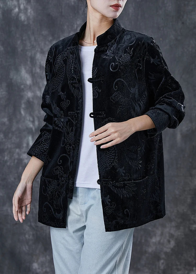 Questa giacca stile Hanfu in velluto nero con motivo drago tono su tono è perfetta per chi vuole distinguersi con raffinatezza.