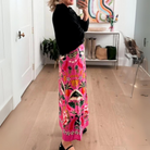 Questa gonna lunga a fantasia tropicale unisce un design vivace e sofisticato, perfetta per chi ama osare con eleganza.