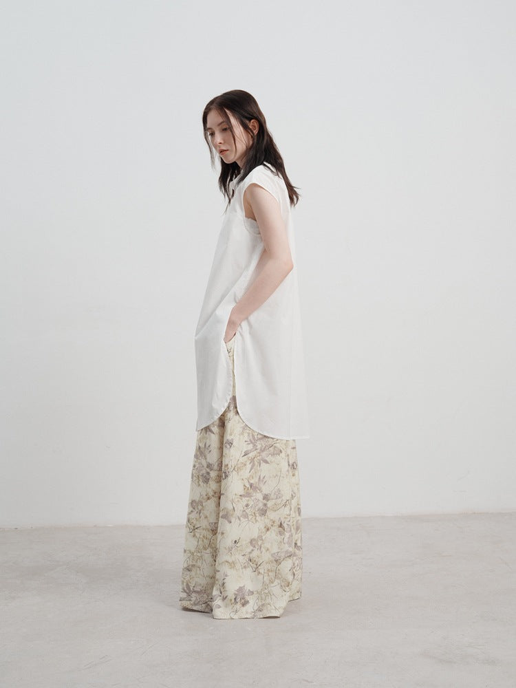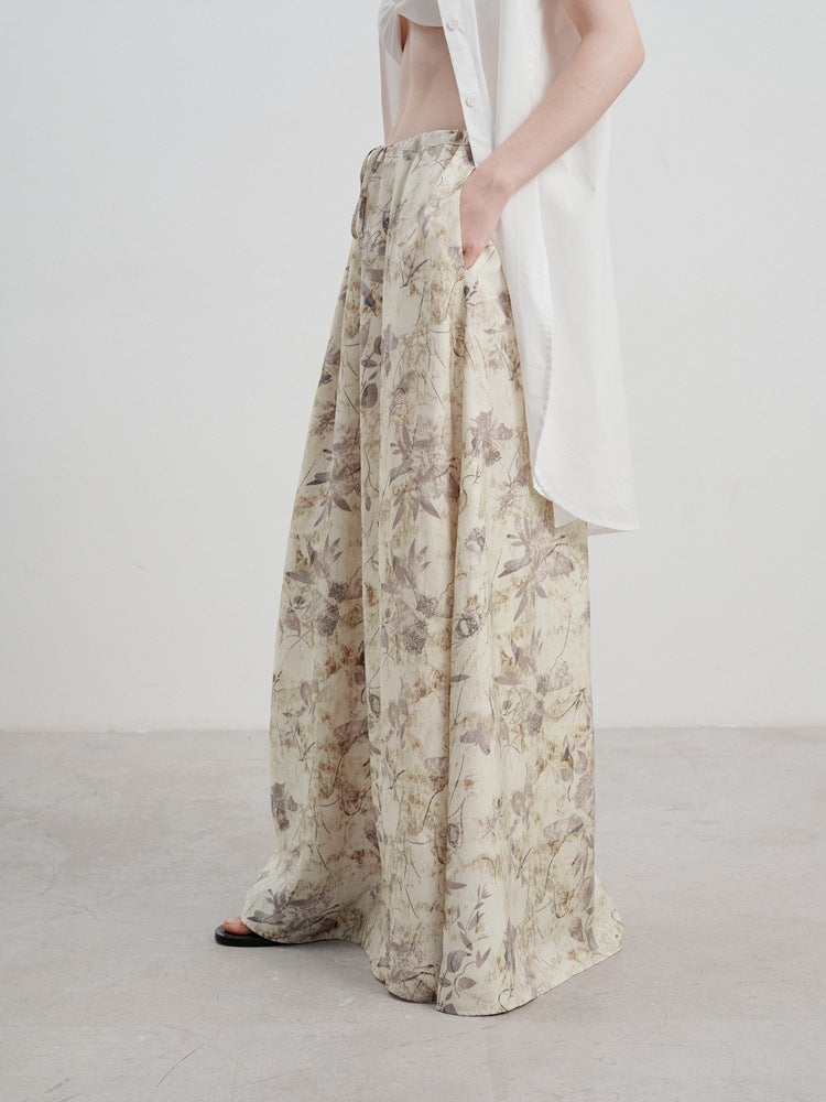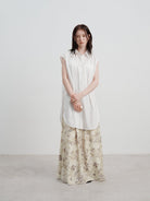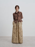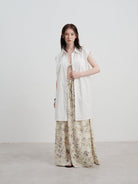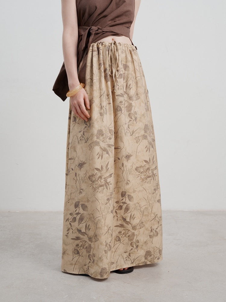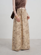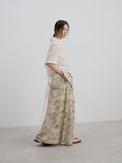 Realizzata in un tessuto leggero e traspirante, questa gonna lunga presenta una stampa botanica delicata su base beige, con motivi floreali effetto disegno antico. Il taglio ampio e la vita elasticizzata la rendono comoda e ariosa, perfetta per accompagnare le giornate più calde con uno stile raffinato ma informale. È il capo ideale per chi ama lo stile slow, naturale e dal gusto bohémien contemporaneo.