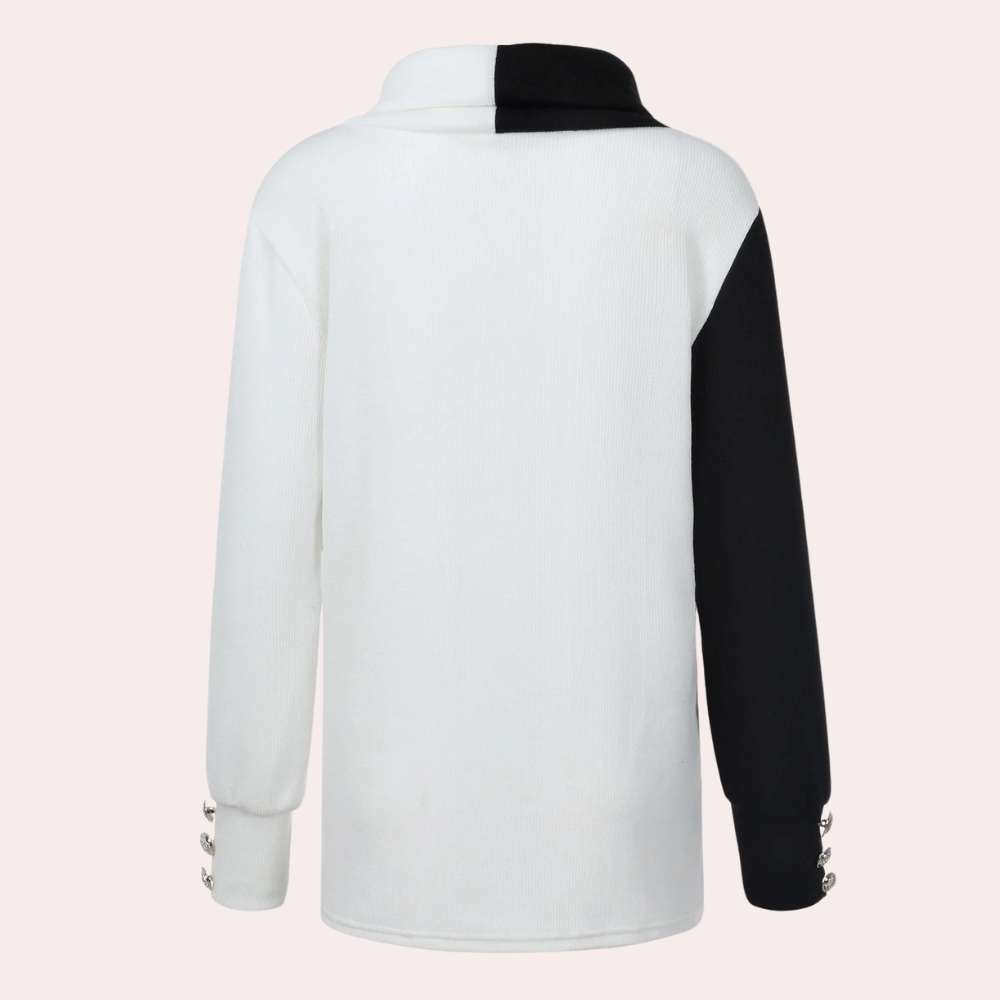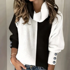 Questo maglione bicolore con collo alto e dettagli con bottoni sulle maniche è perfetto per un look sofisticato e alla moda.