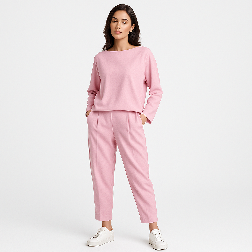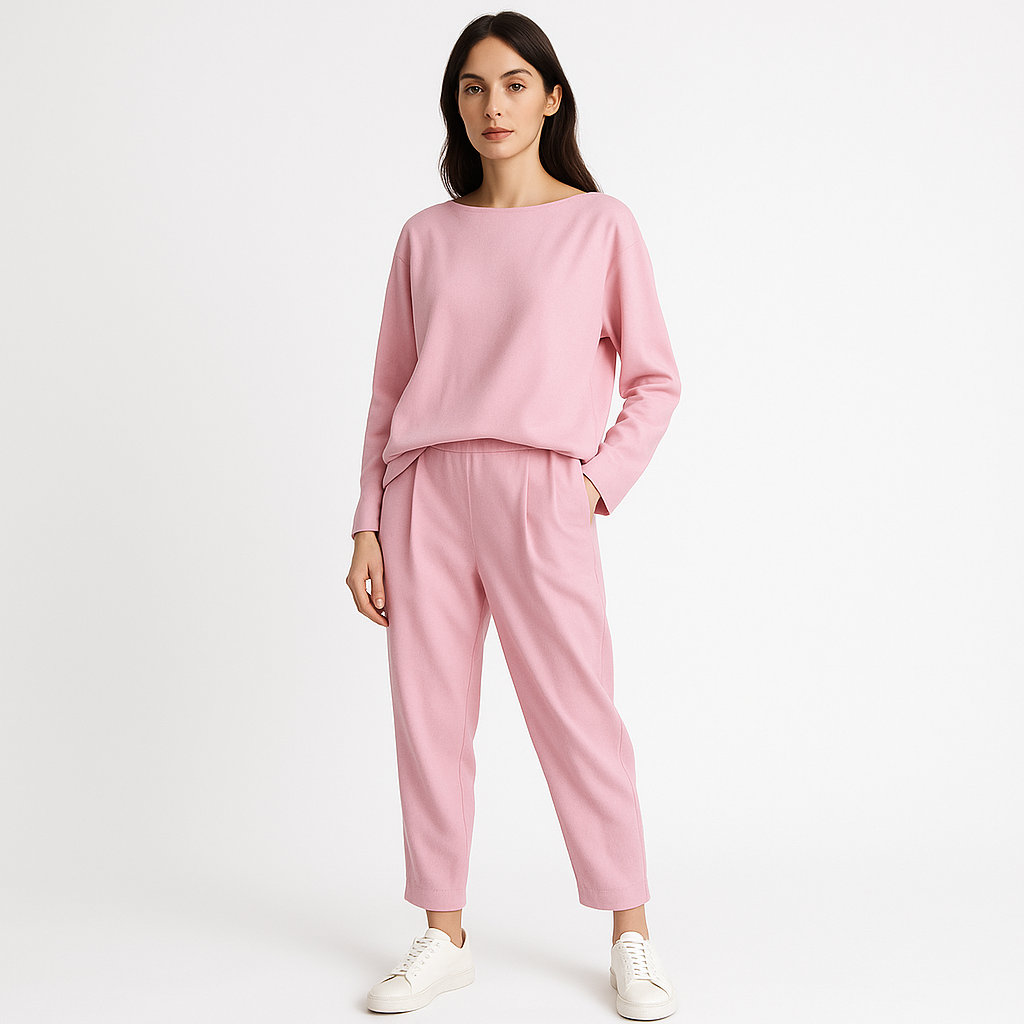 Questo completo minimalista, disponibile in tonalità delicate, unisce comfort e stile in un capo ideale per il relax a casa o le uscite casual.